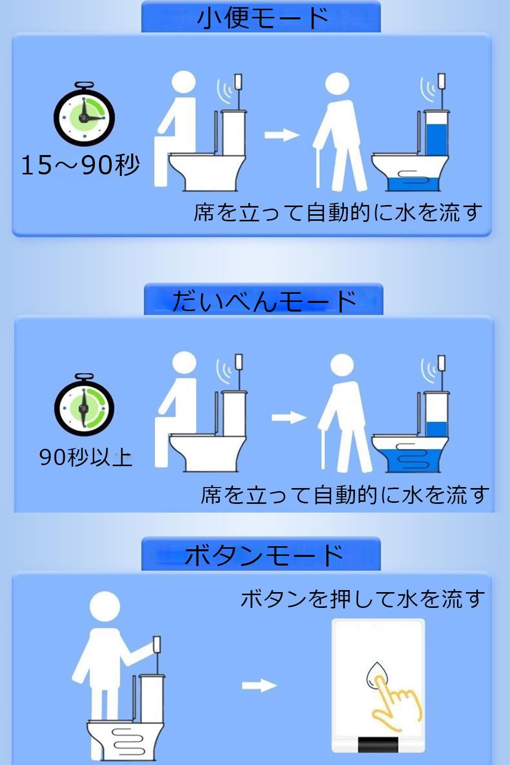 本製品は温水洗浄便座ではなく赤外線センサー式の自動フラッシュデバイスのため、おしり洗浄やビデ洗浄といった洗浄機能は搭載されていません。赤外線センサーが人体を検知し、便座から離れると自動的にトイレの水を流す自動洗浄機能に特化しています。データベース平均の水勢3段階調節のような機能はなく、あくまで既存トイレの洗浄レバーを自動化する製品です。
